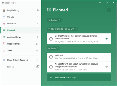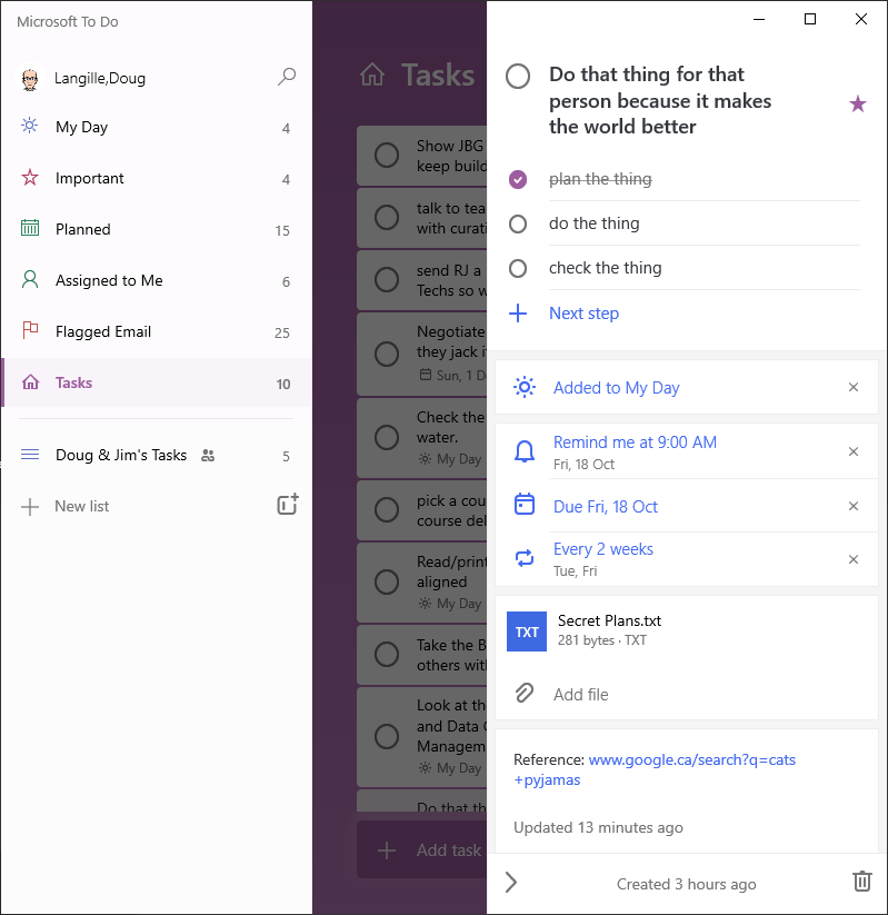 Steps. Some tasks are too big and it’s demoralizing to look at elephantine tasks. If it was more project-like, you could use a separate list or a tool like Planner. But if it’s just a big-ass task, why not break it down into steps? Gotta write that big planning document? Then break it down into steps for Research, Draft, Edit, Peer Review, and Polish. Each step gets a Circle, so there’s that.